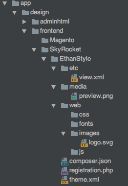 theme.xmland optionally createetcdirectory and create a file namedview.xmlto the theme directory.theme.xmlcontains at least the theme name and the parent theme name (if the theme inherits from one). Optionally you can specify where the theme preview image is stored.view.xmlconfigures product image sizes and other properties used on the storefrontAdd a