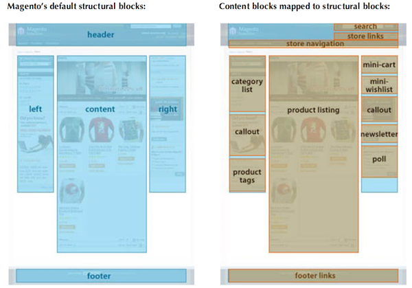 Structural Block 和 Content Block 一般可以用 as 属性区分。一般来说,structural block 代表了header, content, footer 等等,这些信息都在as 属性中,如 <block type="page/html_head" name="head" as="head">。Block 一般有下面几个属性: